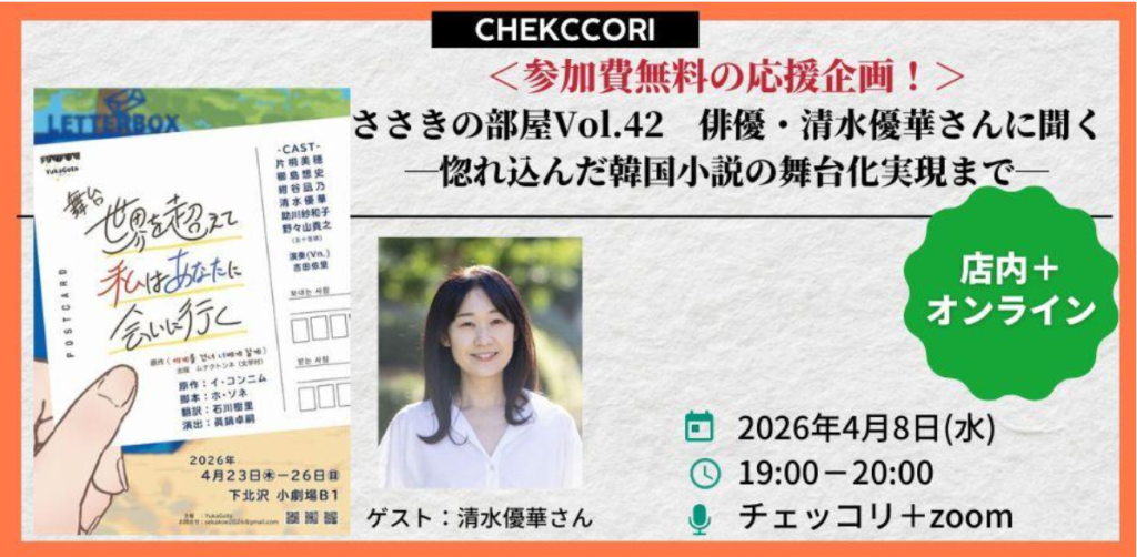 【店内+オンライン】ささきの部屋Vol.42-俳優・清水優華さんに聞く「惚れ込んだ韓国小説の舞台化実現まで」