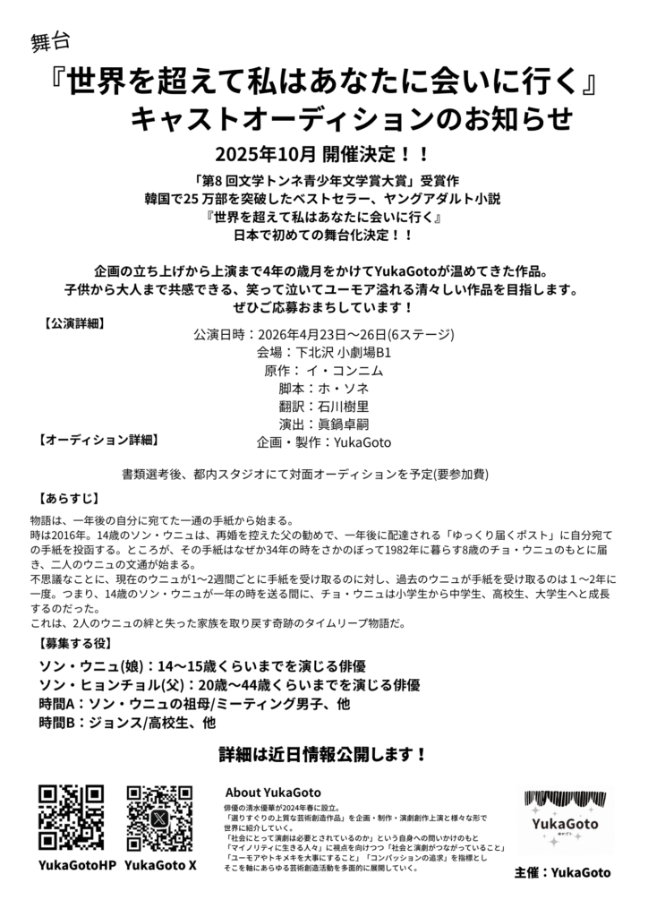 YukaGotoが2026年4月に日本で上演する韓国の小説が原作の舞台『世界を超えて私はあなたに会いに行く』に